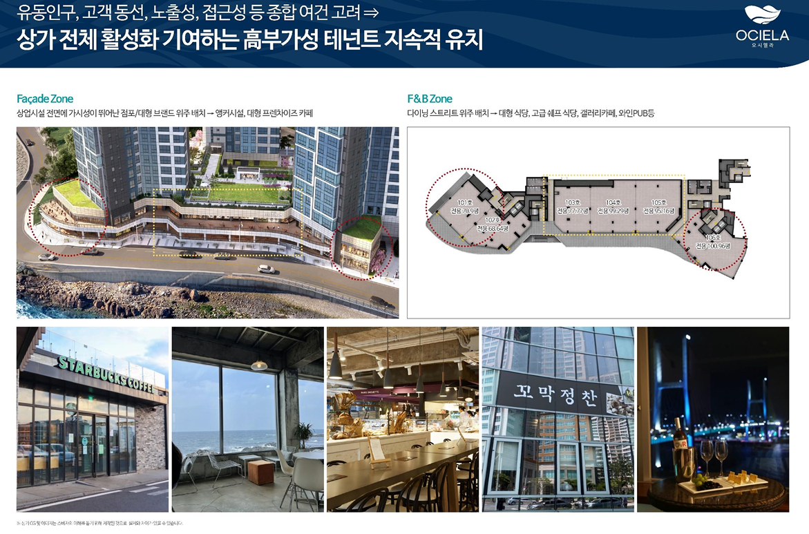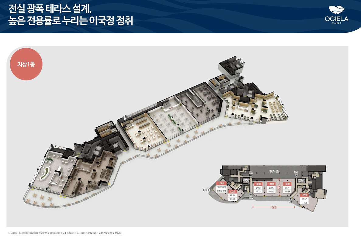 쌍용 더 플래티넘 오시리아 아파트 단지내 상가 오시엘라 상가는 부산광역시 기장군 기장읍 연화리294번지 일대에 위치하며, 근린생활시설 12호실이며, 지상1층 6개실, 해안도로 1층 6개실로 구성되어 있습니다. 준공후 호실 분할도 가능하며 , 특히 전용율이 84%로 가성비 좋은 상가 입니다.
