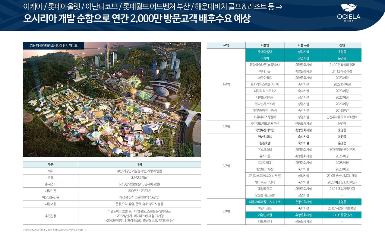 이케아, 롯데아울렛, 아난티코브, 롯데월드 어드벤처 부산, 해운대비치 골프 & 리조트 등 오시리아관광단지 개발 순항으로 연간 2천만명 방문고객 배후 수요 예상