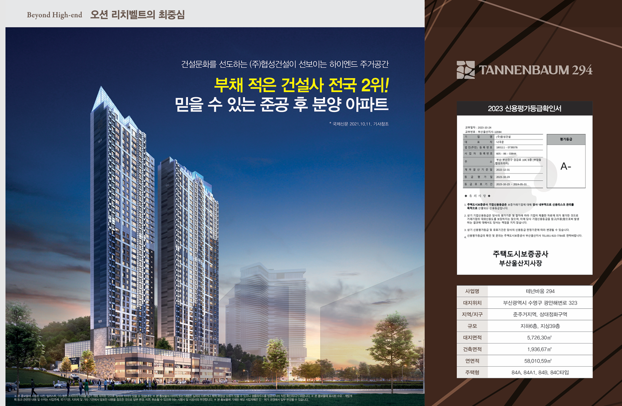 테넌바움 294 아파트는 부산광역시 수영구 광안해변로 323에 위치하며, 지하 6층~지상39층 규모로 총294세대 중 289세대를 분양합니다. 주택형 타입은 84A,84A1,84B,84C외 2개타입으로 구성되어 있습니다.