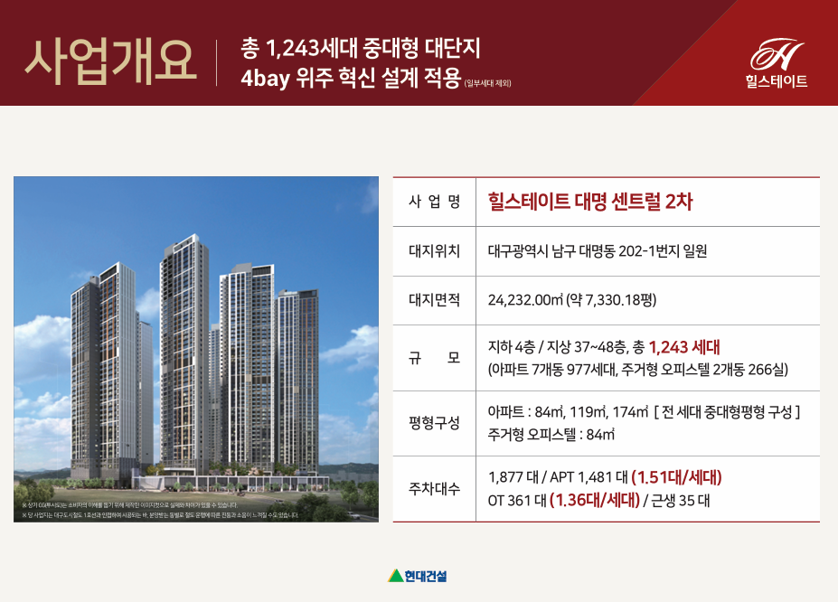 힐스테이트 대명 센트럴2차 아파트는 대구광역시 남구 대명동 202-1번지 일원에 위치하며, 지하4층~지상48층으로 아파트7개동 977세대, 주거형 오피스텔 2개동 266실 규모로 총1,243세대 대단지 프리미엄 브랜드 아파트 입니다.