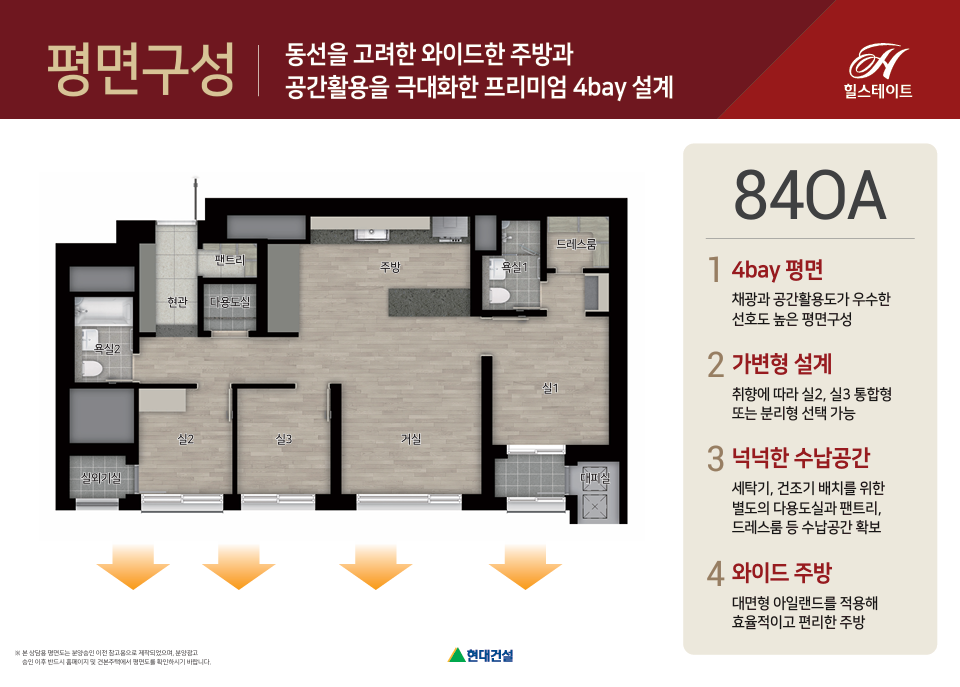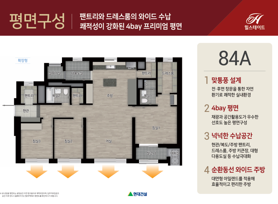 아파트 84A 타입은 맞통풍 설계로 4BAY평면으로 공간활용도가 우수하며, 현관/복도/주방 팬트리, 드레스룸, 주방 키큰장, 대형 다용도실 등 수납공간을 극대화 하였으며, 대면형 아일랜드 주방을 적용해 효율적이고 편리한 주방 설계를 하였습니다.