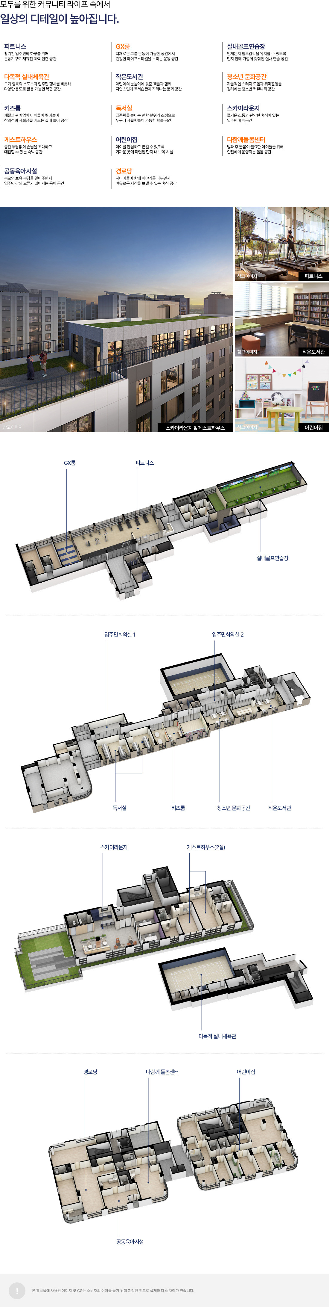 피트니스, 다목적 실내체육관, 키즈룸, 게스트하우스, 공동육아시설, GX룸, 작은도서관, 독서실, 어린이집, 경로당, 실내골프연습장, 청소년 문화공간, 스카이라운지, 다함께 돌봄센터