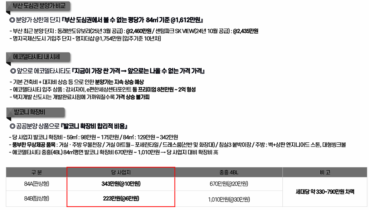 에코델타시티 아테라 아파트는 분양가 상한제 적용 단지라서 34.74평이 평당 1,458만원~ 입니다. 부산시 신규 아파트 및 명지 기입주 아파트대비 착한 분양가를 자랑합니다.